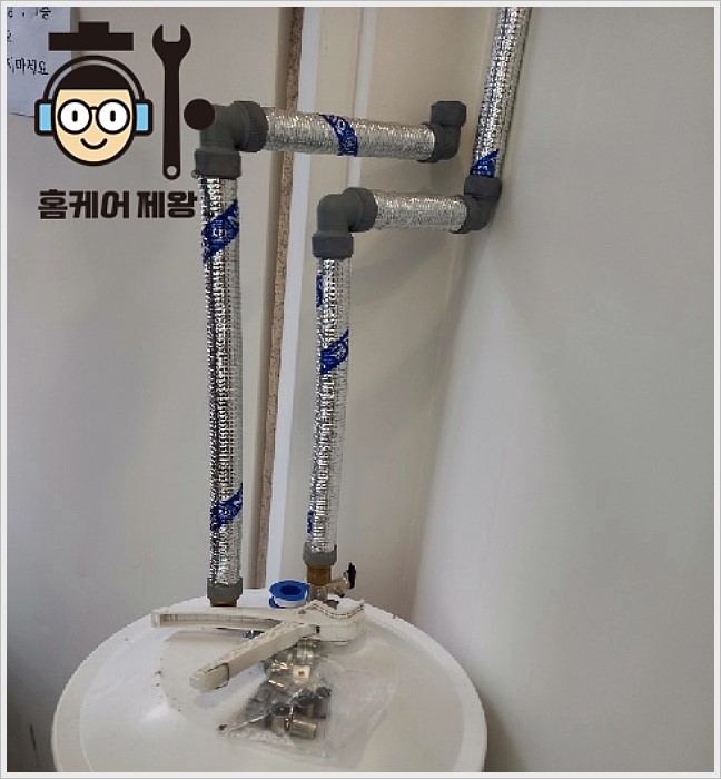 집수리의 모든것- 홈케어제왕은 각 현장의 상황에 맞추어 전기온수기 실치 위치와 배관을 연결하고 부속품 역시 정품으로 제대로 준비하여