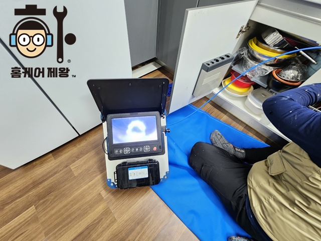 주방 싱크대 하부장은 난방 분배기도 위치해 있고 공간도 매우 협소합니다. 또한 꽉 막혀 물이 역류하는 싱크대 배수관을 눈으로 직접 확인해볼 수 없기에 더욱 내시경기계사용은 전문적이고 효과적인데요.